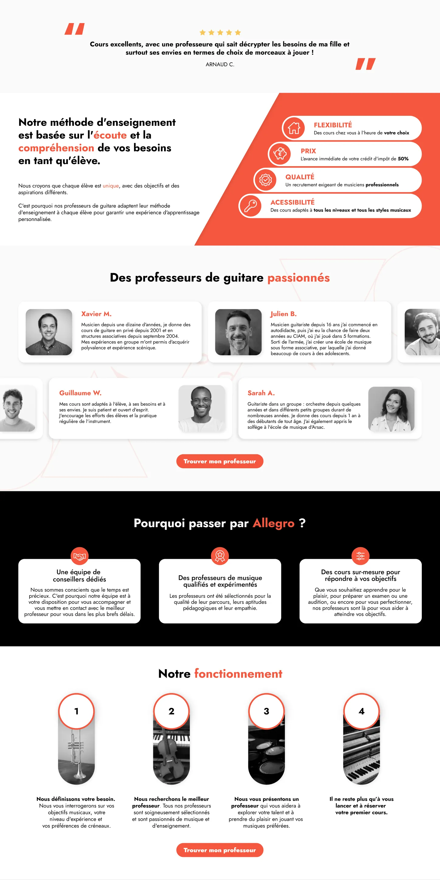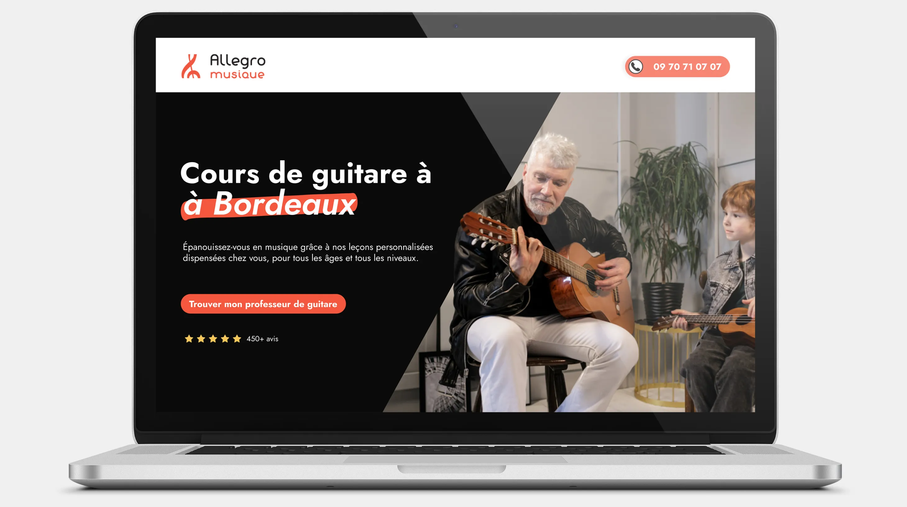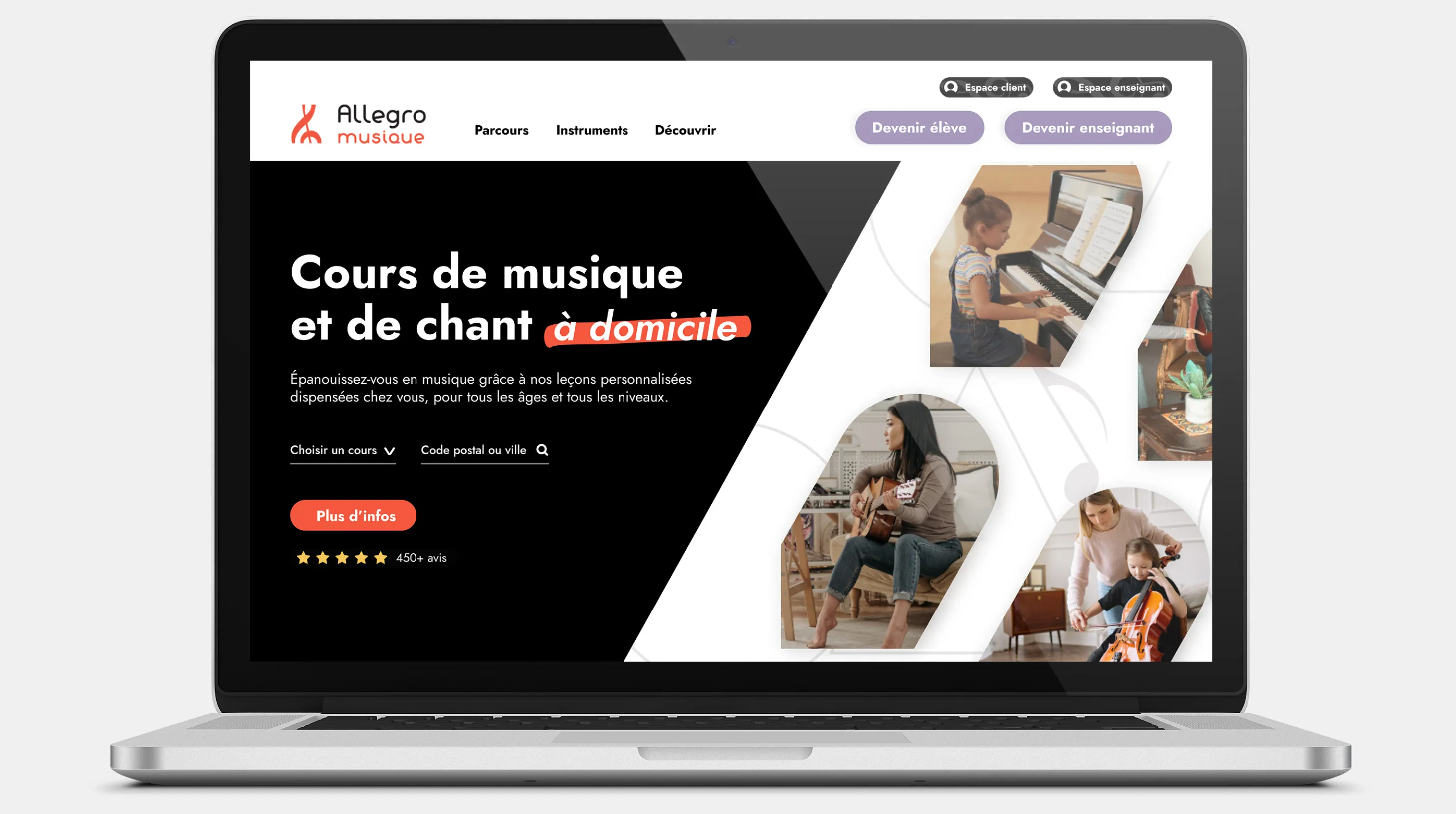 Allegro Musique est une entreprise proposant des services de cours de musique et de chant à domicile. Pour se faire connaître, et en lien avec des campagnes de social ads sur leurs différents réseaux sociaux, ils ont eu besoin de designs de landing pages innovantes, impactantes et engageantes.